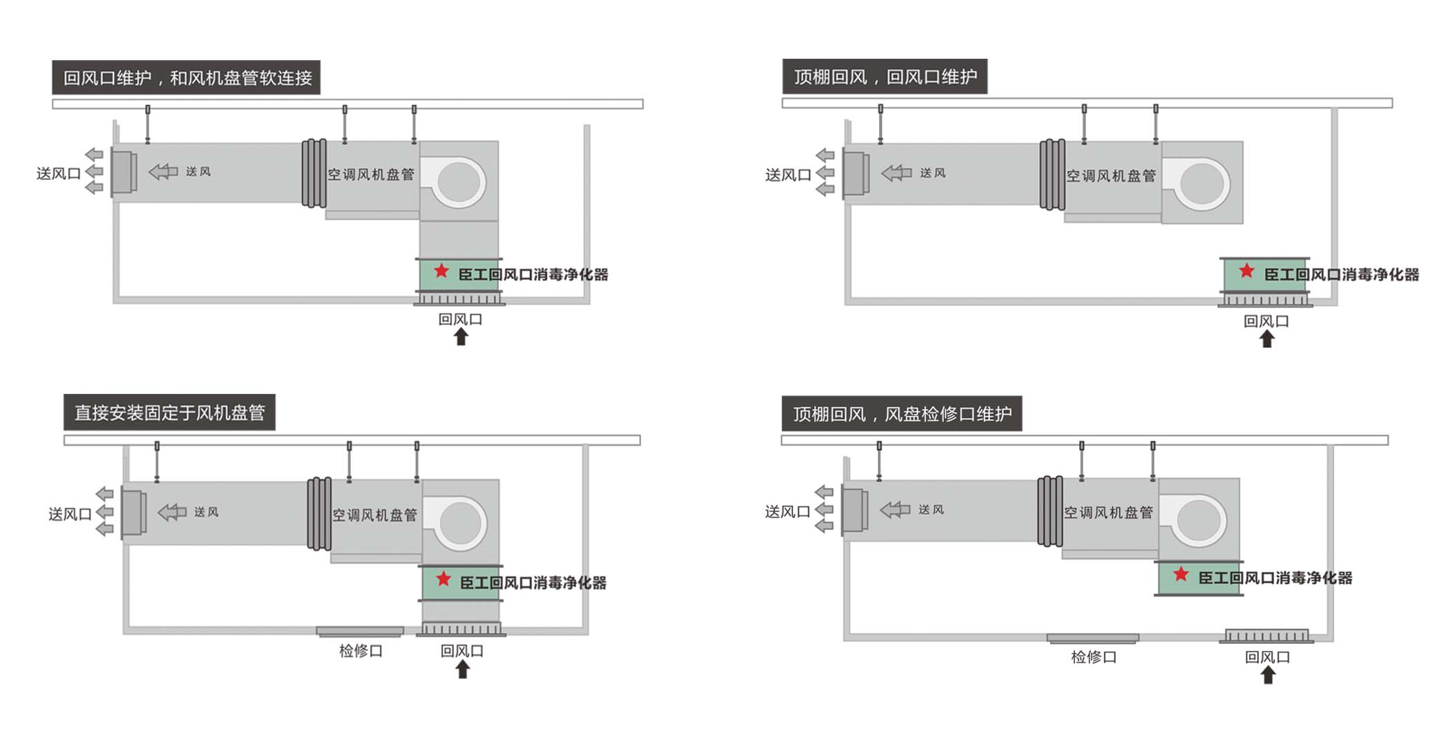 ● 薄型设计大大降低产品高度,安装与回风口,可适用各种风机盘管 和VRV室内机